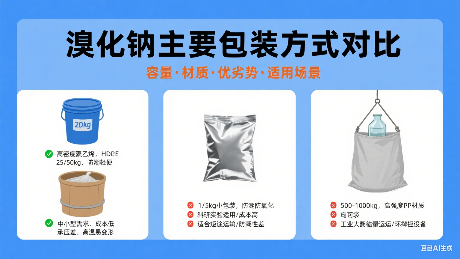 溴化鈉(NaBr)作為一種廣泛應用于化工、醫藥、染料等領域的化學產品,其包裝方式至關重要,直接影響到其運輸、儲存以及使用的便利性。本文將詳細介紹溴化鈉廠家的主要包裝方式。